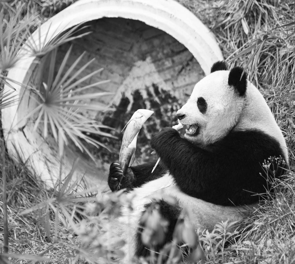 1月3日,大熊猫“巧月”在重庆永川乐和乐都动物主题乐园熊猫馆吃竹笋。