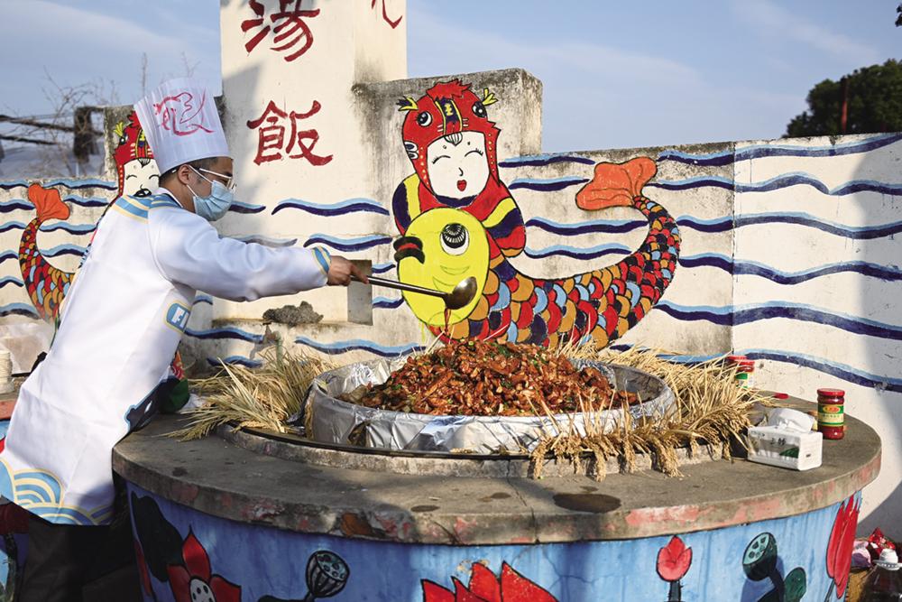 1月5日,和孚镇荻港村的厨师在现场烹饪当地特色的鱼汤饭。 当日,浙江湖州南浔区鱼文化节在和孚镇荻港村开幕,游人赏民俗、品尝鱼汤饭,体验江南水乡丰收场景。一年一度的鱼文化节已成为当地展示桑基鱼塘文化遗产的重要节庆活动。 新华社记者 黄宗治 摄