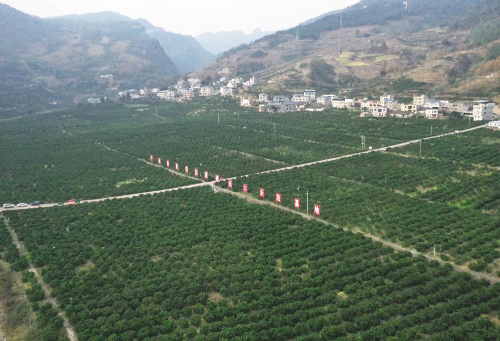 这是1月3日拍摄的古蔺县马蹄镇甜橙种植基地(无人机照片)。 近日,位于赤水河畔的四川省泸州市古蔺县马蹄镇的甜橙进入成熟期,果农忙着采摘、分类,供应市场。 新华社记者 刘坤 摄