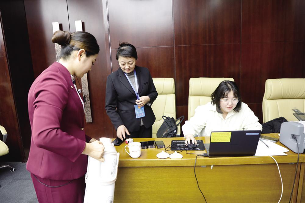 ↑两会工作人员的忙碌身影。 记者 查宝音 摄 →坚守岗位 为两会保驾护航。 记者 查宝音 摄