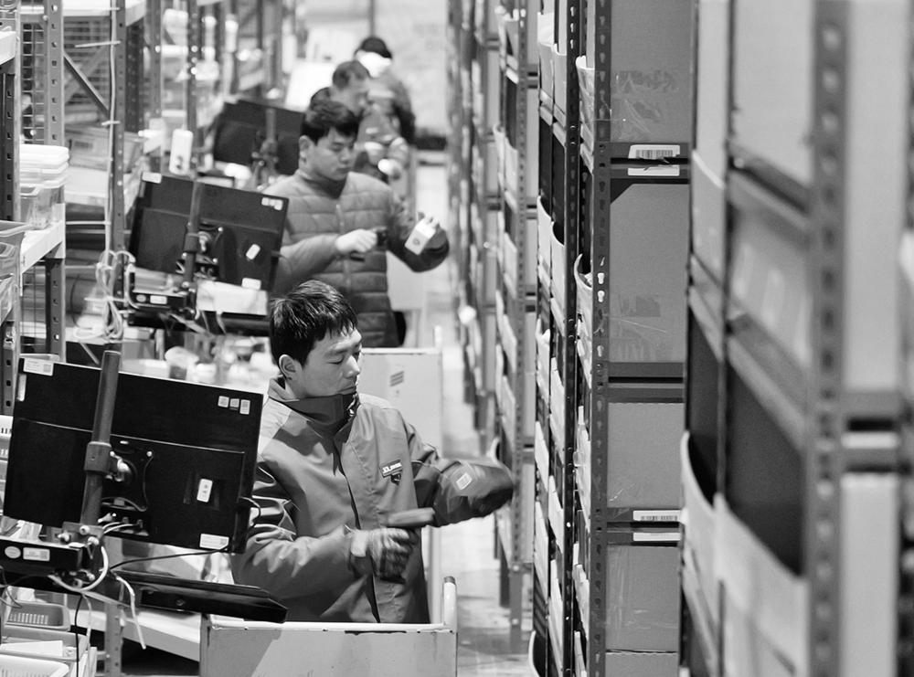 2月7日,在京东物流郑州亚一物流园区,工作人员在拣选货物。