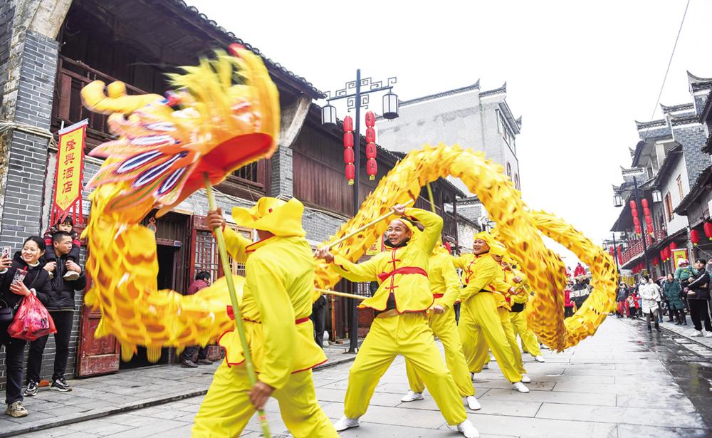 2月7日,参演人员在江西省樟树市临江镇进行舞龙等民俗文化巡演活动。 春节将至,各地举办丰富多彩的民俗展演活动,热热闹闹迎新春。 新华社发(周亮 摄)