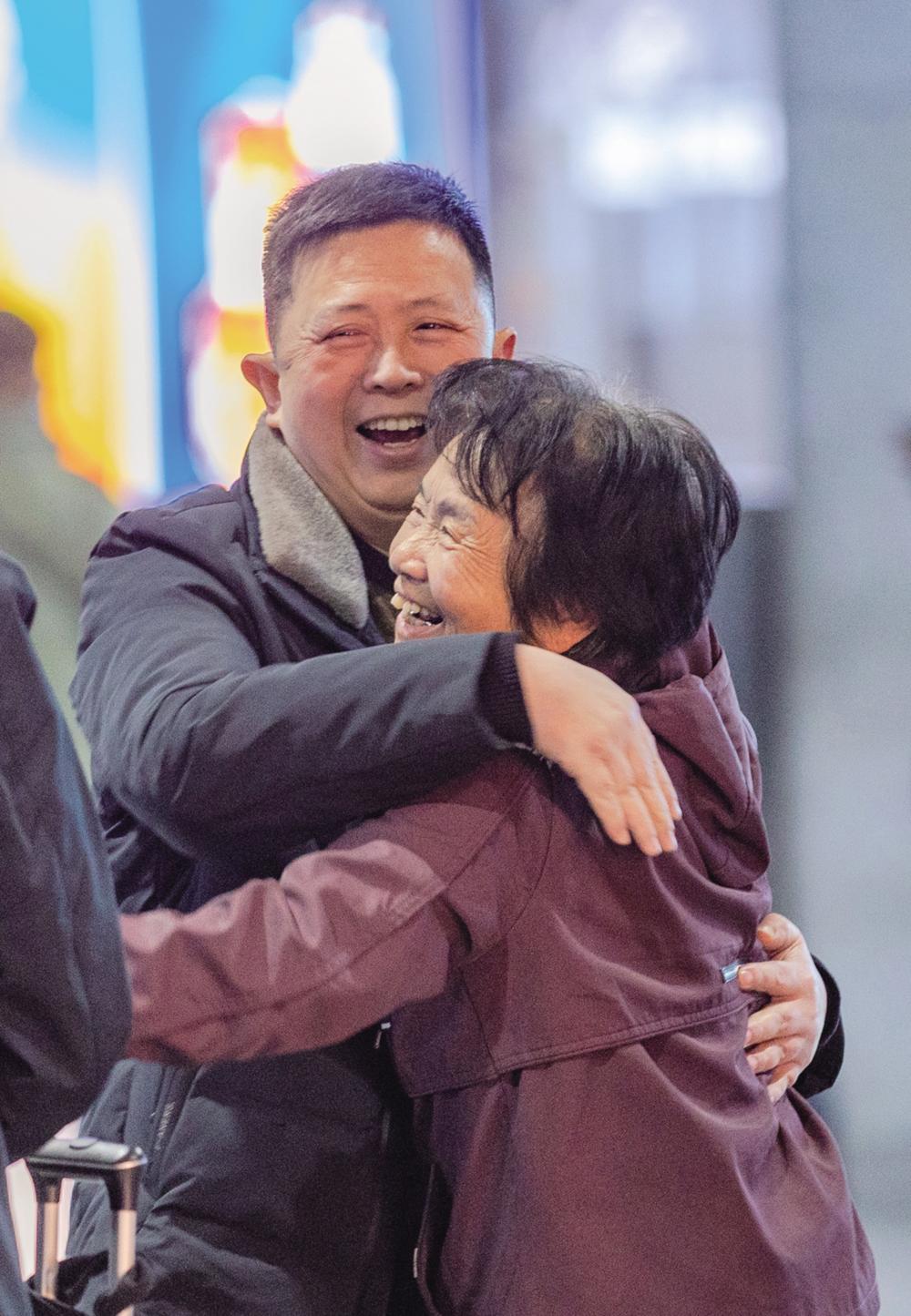 2月5日,在重庆北站北广场,赵兴松(左)与从黑龙江来重庆过年的姨妈拥抱。 除夕将至,出站口人潮涌动。每双眼睛都在热切地搜寻,每颗心都在期待着重逢。 出站的那一刹,百般辛苦皆抛脑后,眼中只有亲友的笑颜;回到家的那一刻,万种相思终得释然,心中满是团圆的喜悦。 山水终相见,重逢就是年。新华社记者 黄伟 摄