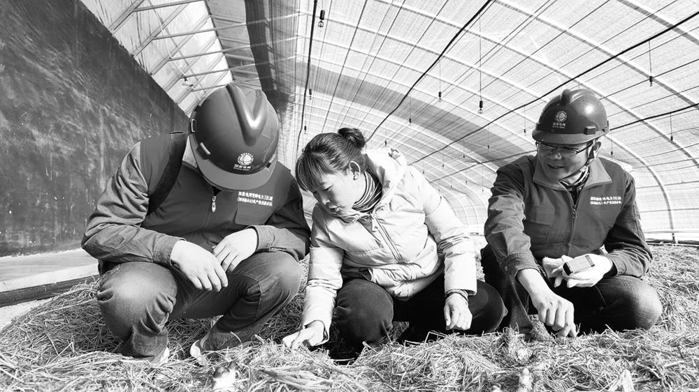 供电员工检查恒温智能大棚内赤松茸生长情况。通讯员 许小萍 摄