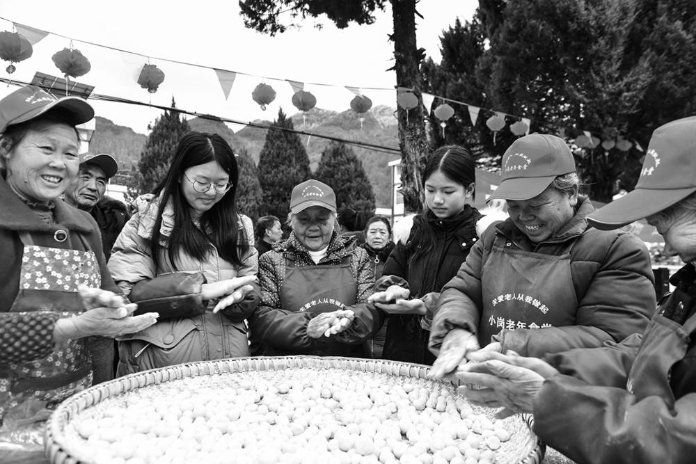 2月24日,在重庆市酉阳土家族苗族自治县小河镇小岗村老年食堂,青年志愿者陪老人一起做元宵、包汤圆。 当日是元宵佳节,各地群众举办多样活动迎接佳节的到来。 新华社发(邱洪斌 摄)