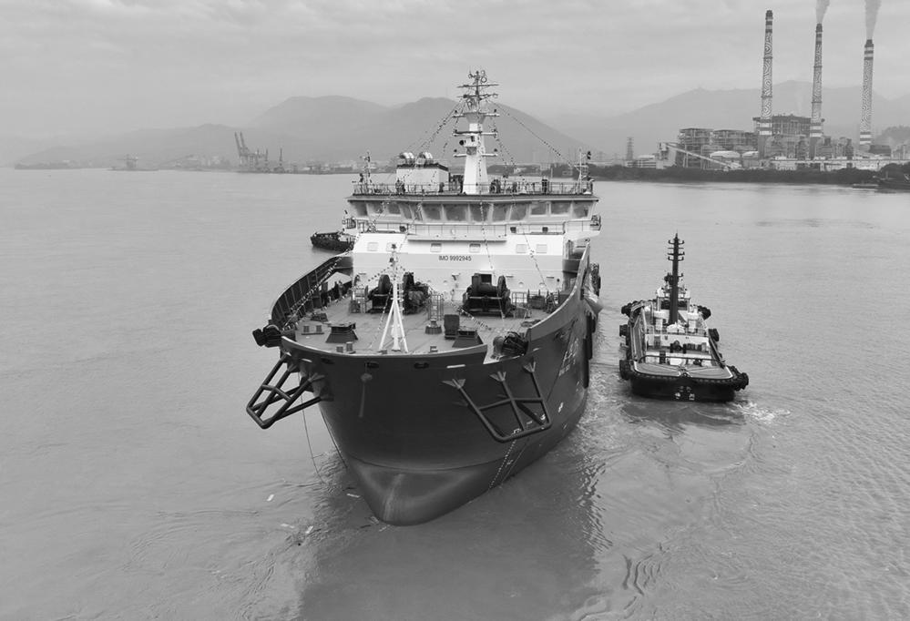 2月29日,我国自主设计、建造,并拥有完全自主知识产权的全电力驱动海上风电多功能运维母船“M913-1”船在福州马尾顺利下水。 这艘由中国船舶集团为福建海电运维科技股份有限公司设计的大型全电力驱动海上风电多功能运维母船,船长98.7米,型宽22.8米,设计排水量9497吨,续航力超过10000海里,为无限航区船舶。该船既能为海上风电提供深远海运维服务,也能提供海底电缆铺设和检修功能服务,是目前国内较为先进、综合性能较高的全电力驱动海上风电多功能运维母船。 新华社记者 林善传 摄