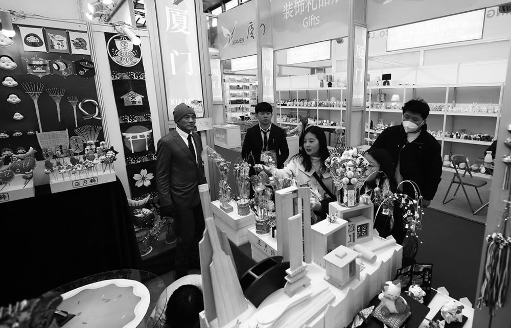 3月1日,几名采购商(右)在一家日式装饰品展位前驻足观看。 当日,第32届华东进出口商品交易会(简称“华交会”)在上海新国际博览中心拉开帷幕。本届华交会设立服装服饰展、纺织面料展、家庭用品展、装饰礼品展4个专业子展以及境外和跨境电商2个专业展区,来自13个国家和地区的3422家企业前来参展。 新华社记者 方喆 摄