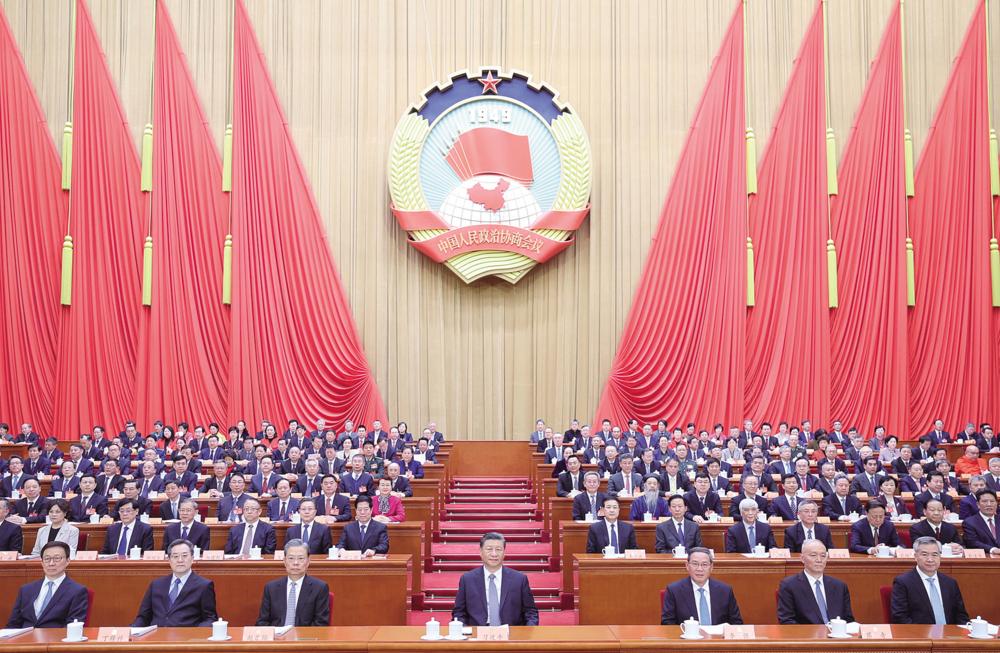 3月4日下午,中国人民政治协商会议第十四届全国委员会第二次会议在北京人民大会堂开幕。这是习近平、李强、赵乐际、蔡奇、丁薛祥、李希、韩正在主席台就座。 新华社记者 鞠鹏 摄