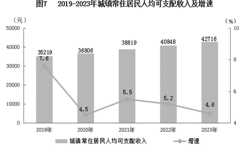 全年全体居民人均可支配收入35727元,同比增长5.5%。其中,城镇常住居民人均可支配收入42716元,增长4.6%;农村常住居民人均可支配收入20310元,增长8.4%。城乡居民人均可支配收入之比为2.10,呈现逐步缩小的态势。