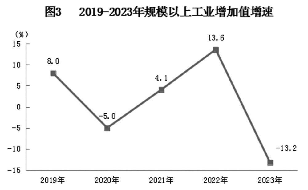 全年规模以上工业[4]增加值同比下降13.2%。按经济类型分,国有企业增加值增长8.8%,股份制企业增加值下降13.5%,外商及港澳台商投资企业增加值下降26.7%;按门类分,采矿业增加值增长1.1%,制造业增加值下降18.8%,电力、热力、燃气及水生产和供应业增加值增长1.5%;按产业分,金属冶金产业增加值增长13.6%,特色生物产业增加值增长10.2%,油气化工产业增加值增长2.9%,新能源产业增加值下降5%,盐湖化工产业增加值下降21.8%,新材料产业增加值下降26.6%,煤化工产业增加值下降32%。