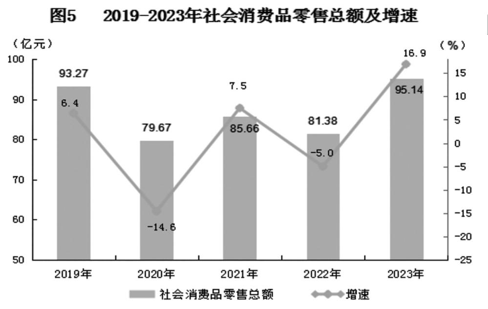 全年社会消费品零售总额95.14亿元,同比增长16.9%。按规模分,限额以上单位零售额48.08亿元,增长18.8%,限额以下单位零售额47.06亿元,增长15%;按经营地分,城镇消费品零售额88.94亿元,增长16.6%(其中城区消费品零售额70.10亿元,增长22.4%),乡村消费品零售额6.2亿元,增长21.7%;按消费形态分,商品零售90.35亿元,增长16.8%;餐饮收入4.79亿元,增长18.9%。网络零售额完成12.44亿元,同比增长89.6%。其中,实物商品网络零售额实现3.73亿元,同比增长76.1%。