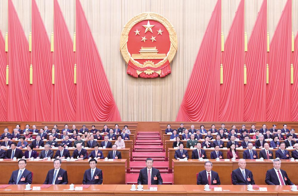 3月11日,第十四届全国人民代表大会第二次会议在北京人民大会堂闭幕。党和国家领导人习近平、李强、王沪宁、蔡奇、丁薛祥、李希、韩正等在主席台就座。 新华社记者 谢环驰 摄