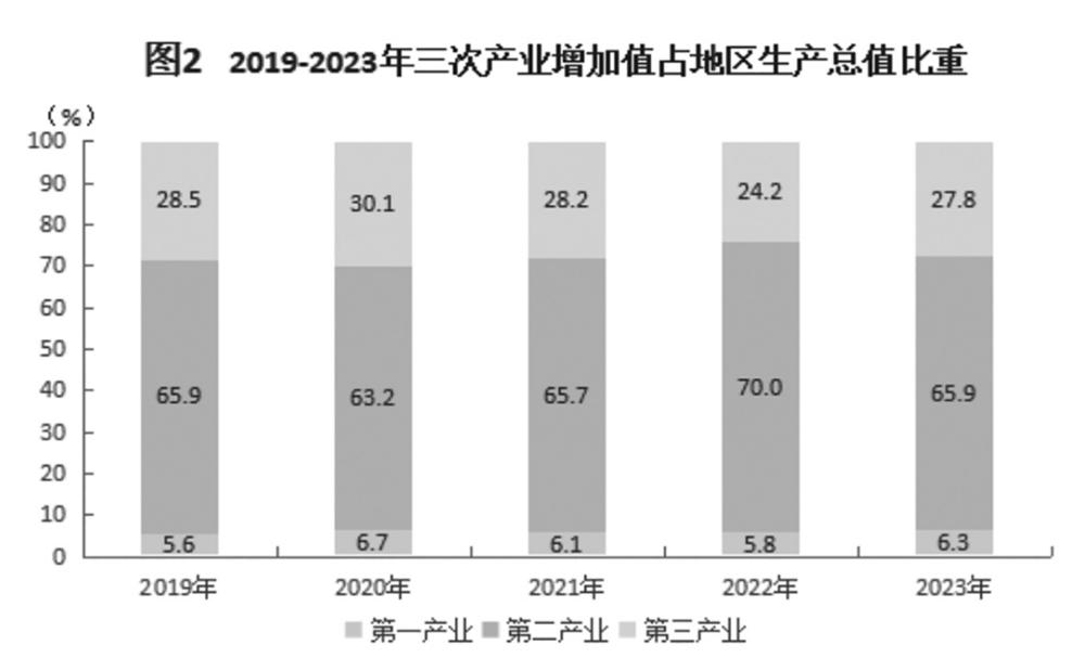 根据地区生产总值统一核算结果,全年生产总值[2]828.19亿元,按可比价格计算总量与上年持平。分产业看,第一产业增加值51.92亿元,同比增长5%;第二产业增加值545.65亿元,同比下降5.1%;第三产业增加值230.62亿元,同比增长10.6%。三次产业比重为6.3:65.9:27.8。