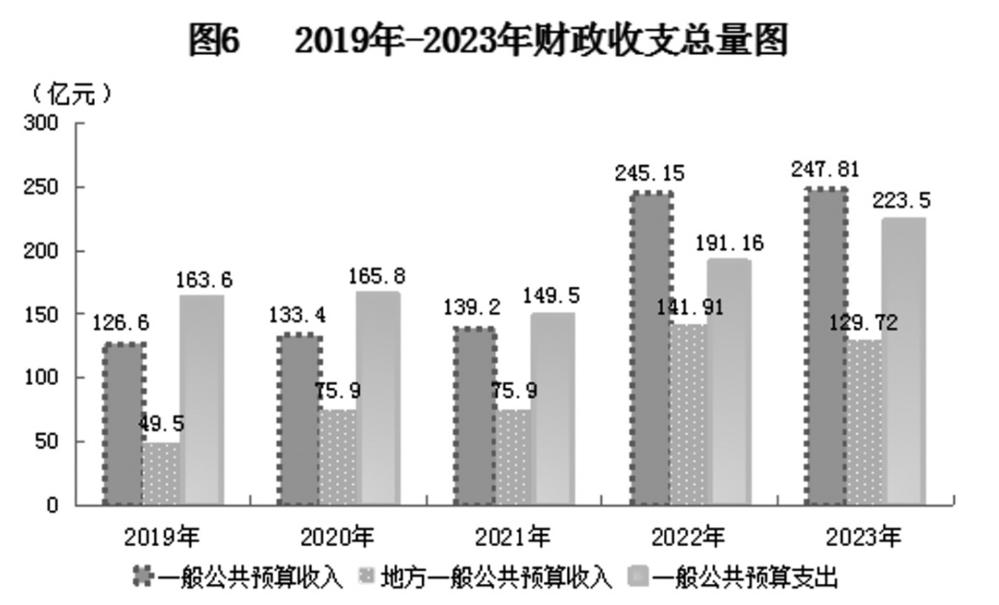 全年一般公共预算收入247.81亿元,同比增长1.1%。其中,地方一般公共预算收入129.72亿元,下降8.6%。地方一般公共预算收入中税收收入115.77亿元,下降12%。其中,增值税41.75亿元,下降17.2%;企业所得税21.07亿元,下降11%;个人所得税2.67亿元,增长48.2%;资源税34.28亿元,下降8.1%;城市建设维护税6.29亿元,下降21%。全年一般公共预算支出223.5亿元,同比增长16.9%。其中,教育支出16.82亿元,增长5.6%;科学技术支出0.69亿元,增长34.6%;文化旅游体育与传媒支出5.48亿元,增长30%;社会保障和就业支出30.68亿元,增长7.2%;卫生健康支出13.81亿元,下降12.1%;城乡社区支出51.92亿元,增长68.8%;交通运输支出6.26亿元,下降15.6%。