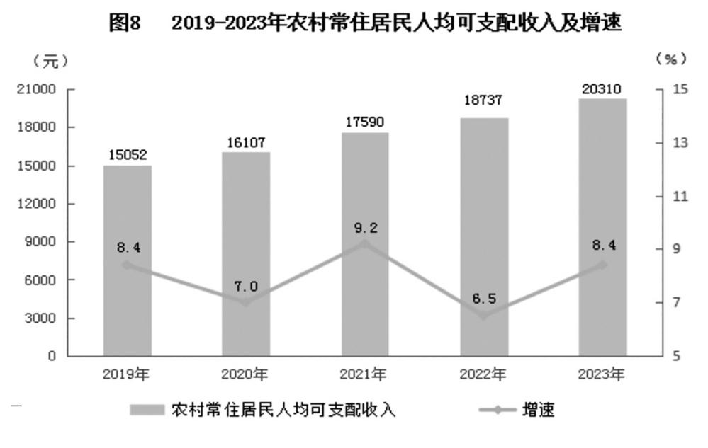 全年全体居民人均可支配收入35727元,同比增长5.5%。其中,城镇常住居民人均可支配收入42716元,增长4.6%;农村常住居民人均可支配收入20310元,增长8.4%。城乡居民人均可支配收入之比为2.10,呈现逐步缩小的态势。