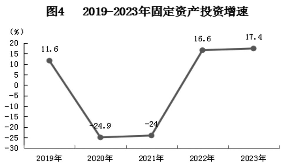 全年固定资产投资[6]同比增长17.4%。按产业分,第一产业投资下降18.1%,第二产业投资增长20.8%,第三产业投资增长3.7%;按门类分,制造业投资增长157.3%,电力、热力、燃气及水生产和供应业投资增长16.9%,水利、环境和公共设施管理业投资增长28.6%,居民服务、修理和其他服务业投资增长14.9%,教育业投资增长9.4%;按经济类型分,国有投资增长17%,民间投资[7]增长18.8%;按主要投资领域分,一般性工业投资增长25.8%,新能源项目投资增长17%,基础设施投资[8]增长14.5%,房地产开发投资下降12.3%。