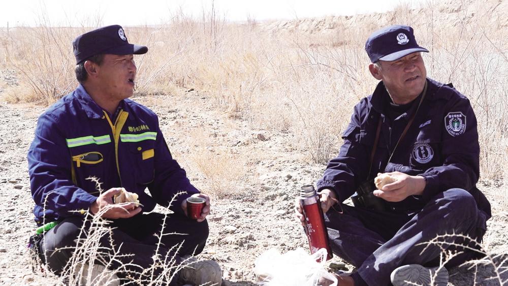 话音刚落,两人便从包里拿出干粮和水壶,坐在路边津津有味地吃了起来。日复一日的行走,简单的午餐……李岩和同事用14年的坚守,在茫茫戈壁筑起了一道坚固的绿色屏障。