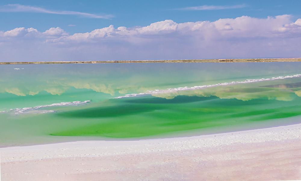 翡翠湖 这片形态迥异、深浅不一的盐池,由于所含矿物质浓度不同,形成不同色彩。