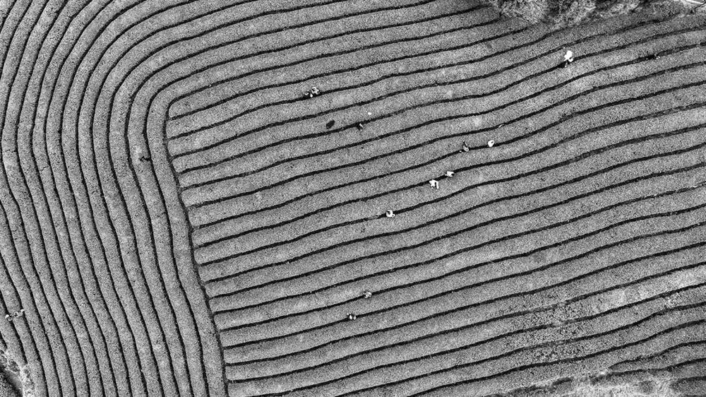 3月16日,人们在贵州省遵义市凤冈县的生态茶园里采摘春茶(无人机照片)。