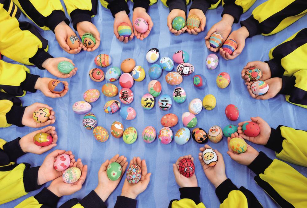 3月19日,在山东省枣庄市文化路小学,学生们展示绘制的彩蛋。 春分节气临近,各地通过立蛋、做风筝等民俗活动,迎接春分到来。 新华社发(孙中喆 摄)