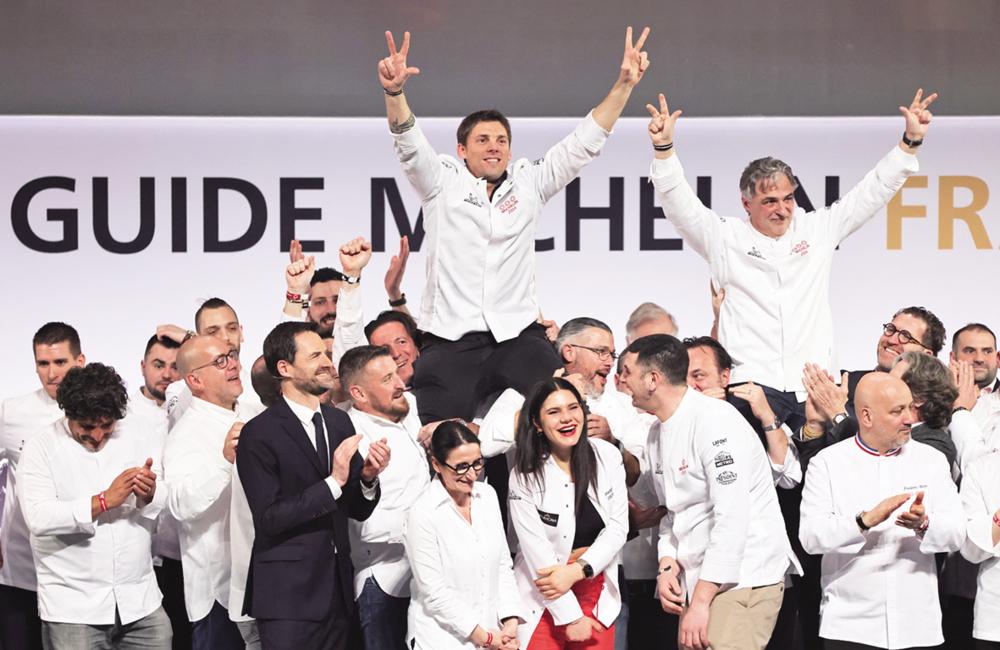 3月18日,在法国中央-卢瓦尔河谷大区图尔市举行的2024《米其林指南》法国版发布典礼上,获颁米其林三星的法国厨师法比安·菲埃(上左)和热罗姆·邦克泰尔(上右)振臂庆祝。 18日,2024《米其林指南》法国版在法国中央-卢瓦尔河谷大区图尔市发布,新增两家米其林三星餐馆,8家米其林二星餐馆,52家米其林一星餐馆。 新华社记者 高静 摄