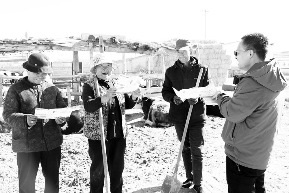 连日来,德令哈市柯鲁柯镇组织干部深入村庄农户、田间地头、农家炕头,结合人居环境整治、撂荒地整治等各项重点工作,以群众喜闻乐见的方式宣讲一号文件精神,确保“一学三促”活动见实见效,让党的“好声音”走进千家万户。 图为中国铁路青藏集体公司莲湖村驻村工作队员冶挺深入田间地头向脱贫户刘永芳和村民宣讲一号文件精神。 本报记者 查宝音 摄影报道