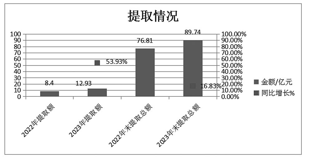 提取金额。2023年,我州提取额12.93亿元,同比增长53.93%;占当年缴存额的74.48%,比上年增加19.43个百分点。截止2023年末,提取总额89.74亿元,同比增长16.83%。