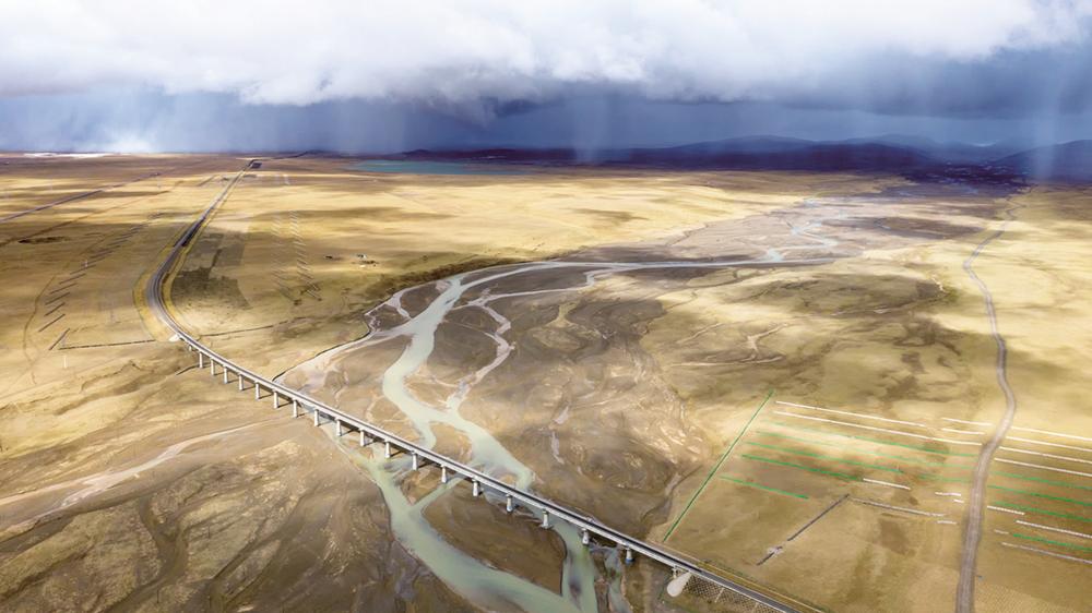 通天河,庄严而壮美。在通天河海西州格尔木段,青藏铁路、青藏公路、青藏联网工程线路交会,建设者人定胜天的智慧结晶和大自然的神奇伟力在此完美交融。(来源:青海日报)