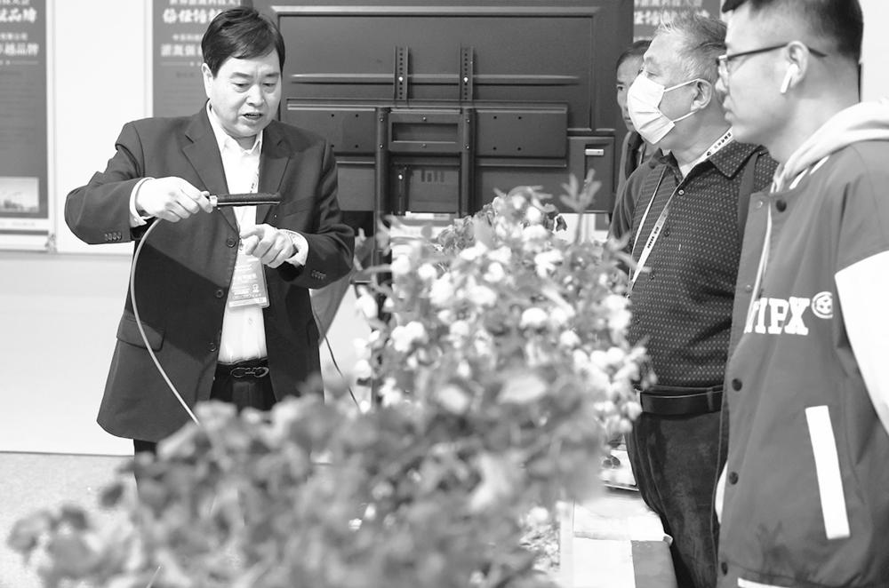 3月31日,参展企业工作人员向参观者介绍一款节水灌溉设备。 当日,第十届北京国际数字农业与灌溉技术博览会在北京国家会议中心开幕。本届展会以“新制造 新服务 新业态”为主题,为现场观众展示了大量数字农业与灌溉技术领域的先进装备与技术。新华社记者 张晨霖 摄