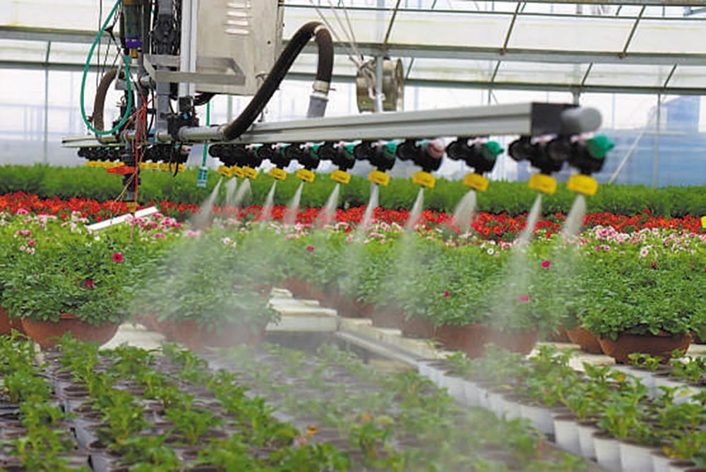 在湖北省宜昌市夷陵区一座智能化育苗工厂内,自动喷水系统正在给蔬菜等种苗喷水保墒。近年来,夷陵区引进智能化育苗和播种设备,提高种苗的生产效率。李重庆 摄(影像中国)