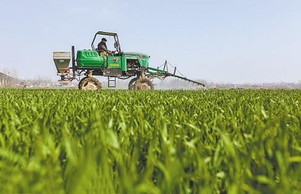 在安徽省当涂县江心乡优质麦田里,农民正驾驶喷雾机进行除草剂喷洒作业。田先进 王文生 摄影报道