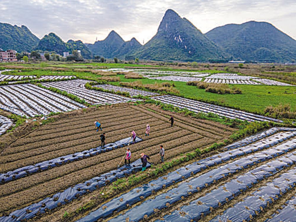 在广西壮族自治区贺州市平桂区羊头镇羊头村,当地农民使用先进覆膜技术种植香芋,田间地头呈现出一派春耕农忙景象。 黎豪图 摄(影像中国)