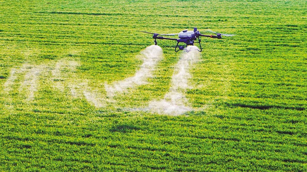 飞防无人机在河南省商丘市柘城县小麦托管示范田内给小麦喷洒农药。此次喷药可起到杀菌、杀虫和调节植物生长等作用,为小麦返青生长、丰产增收打下坚实基础。毕京津 张子斌 摄影报道