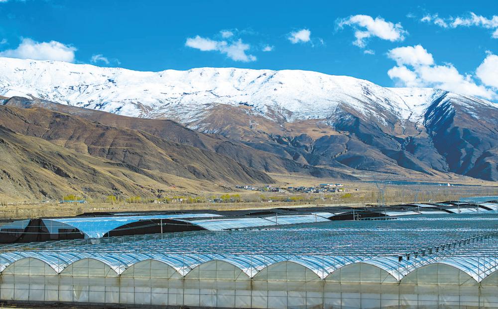 在西藏自治区山南市琼结县,智慧大棚与远处的雪山相映成趣。当地大力发展智慧大棚,利用技术改良土壤质量,将盐碱地改造成高产田。人民日报记者 徐驭尧 摄
