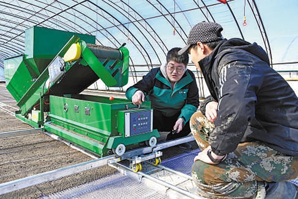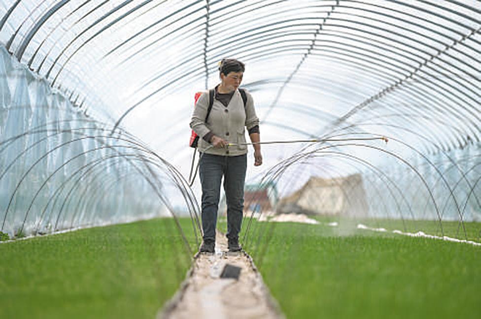在天津市宝坻区口东镇的天勤家庭农场大葱育苗基地大棚内,农民为大葱苗喷洒营养液。近期,宝坻区多个乡镇的家庭农场开展智能化、订单化育苗工作,大棚内一派繁忙景象。 新华社记者 孙凡越 摄