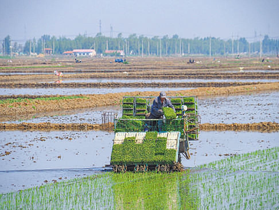 在辽宁省沈阳市沈北新区兴隆台街道,农民驾驶农机进行机械化插秧。刘佳华 付 饶 摄影报道