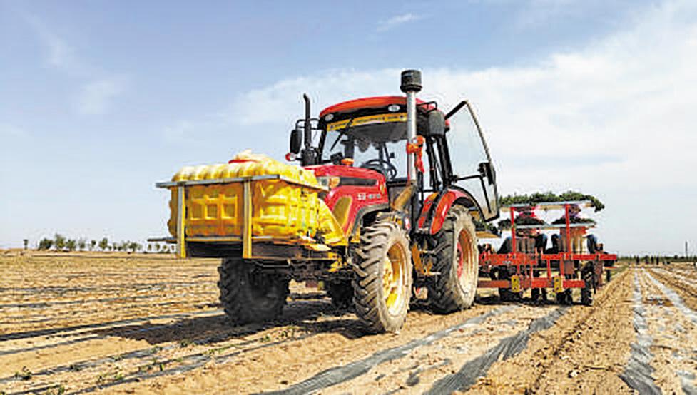 在甘肃省临泽县新华镇长庄村番茄种植基地里,装有北斗卫星导航系统的无人驾驶拖拉机正在将番茄苗植入田地。 赵帅杰 李 炳 摄影报道