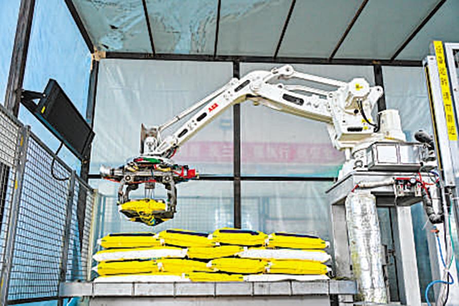 在新疆维吾尔自治区昌吉高新区的一处化肥生产车间内,生产线正开足马力,加紧生产各类肥料,为春耕生产提供有力保障。图为智能机器人在将生产出的水溶肥进行码垛。 陶维明 摄(影像中国)