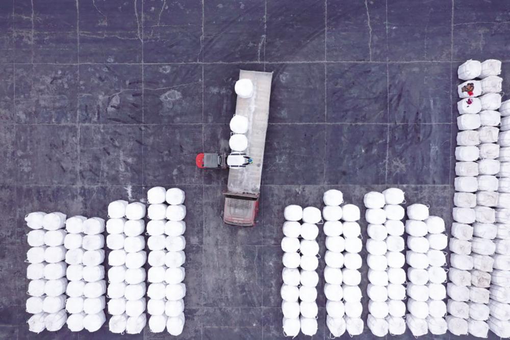3月14日,在青海盐湖工业股份有限公司钾肥分公司货场,车辆在装运钾肥(无人机照片)。 新华社记者 陈杰 摄
