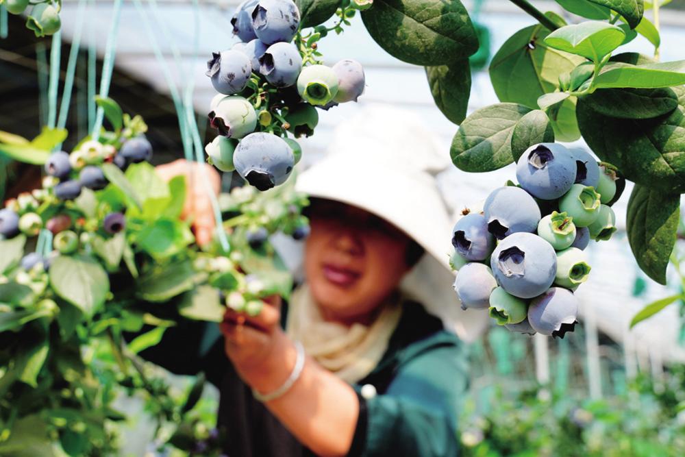 4月10日,在山东省巨野县龙堌镇龙麟现代农业产业园,农民在采摘蓝莓。 龙堌镇以发展特色果蔬种植、农副产品精深加工、纺织服装加工等产业,促进农民就近就业和稳定增收。新华社记者 郭绪雷 摄