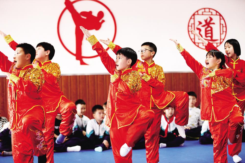 4月19日,青岛通济实验学校学生在大课间活动中学习武术。 近年来,位于山东省青岛市即墨区的青岛通济实验学校积极落实“双减”政策,全面推进学生素质教育,围绕“班班有特色,人人有特长”的教学育人目标,组建京剧、击剑、武术、陶艺等多个校园社团,让学生在丰富多彩的大课间活动中陶冶情操,健康快乐成长。新华社发(梁孝鹏 摄)