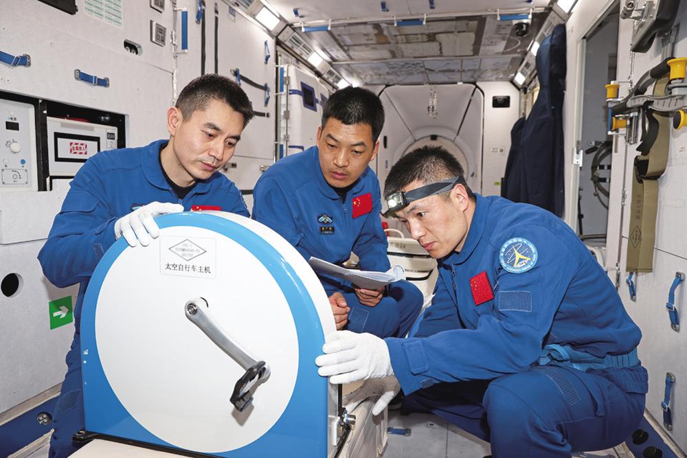 2024年2月18日,神舟十八号航天员乘组在进行太空自行车组装训练。 新华社发(徐部 摄)