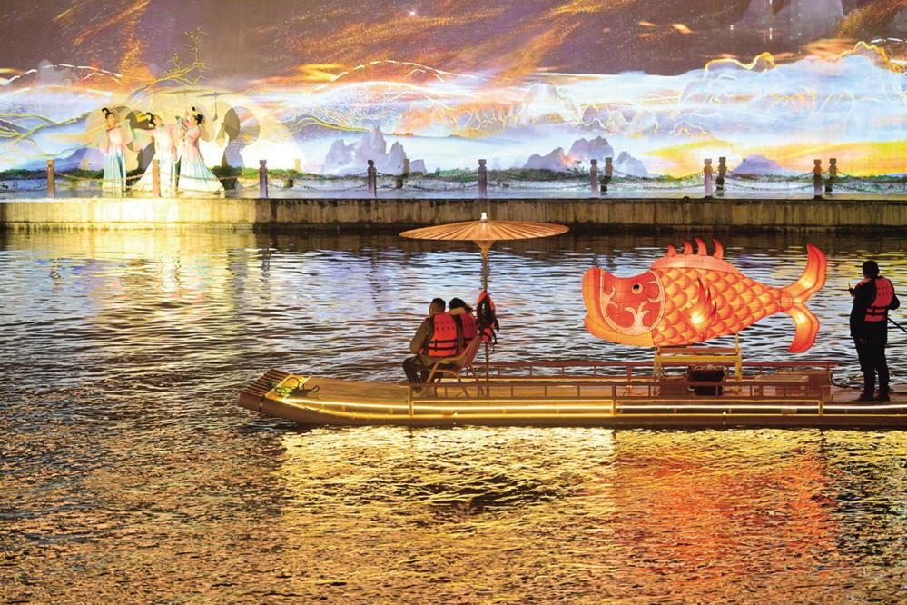 游客乘坐竹筏在湖北省宣恩县贡水河上观看河岸实景歌舞表演(2024年2月20日摄)。春节期间,当地组织丰富多彩的文化活动,吸引大批游客前来赏景游玩,为山乡经济注入活动。 新华社发(宋文 摄)