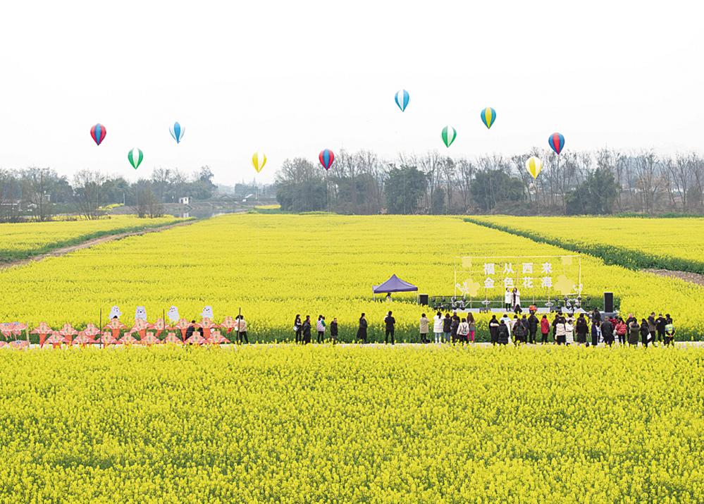 ? 在四川省成都市蒲江县西来镇敦厚社区,游客徜徉在油菜花海里(2024年3月8日摄,无人机照片)。 新华社记者 江宏景 摄