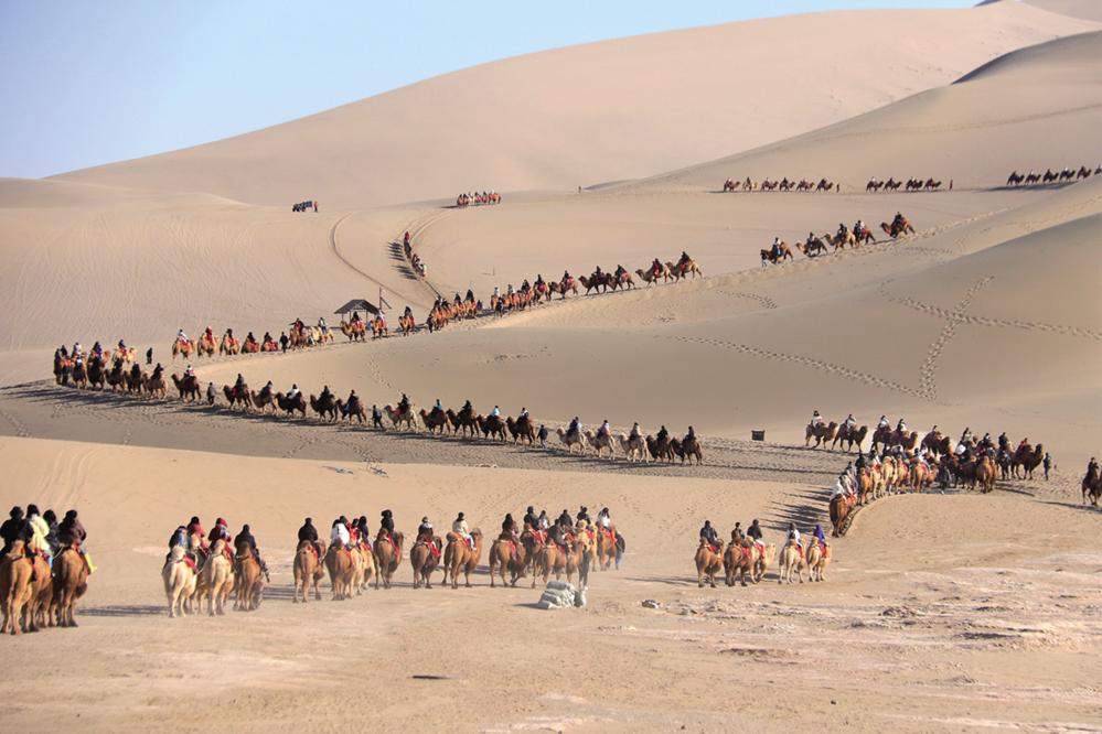 2024年春节迎来“8+1”假期,民众出游热情高涨,各地景区景点迎来参观热潮,文旅市场实现“开门红”。这是游客在甘肃省敦煌市鸣沙山月牙泉景区游览(2024年2月14日摄)。 新华社发(张晓亮 摄)