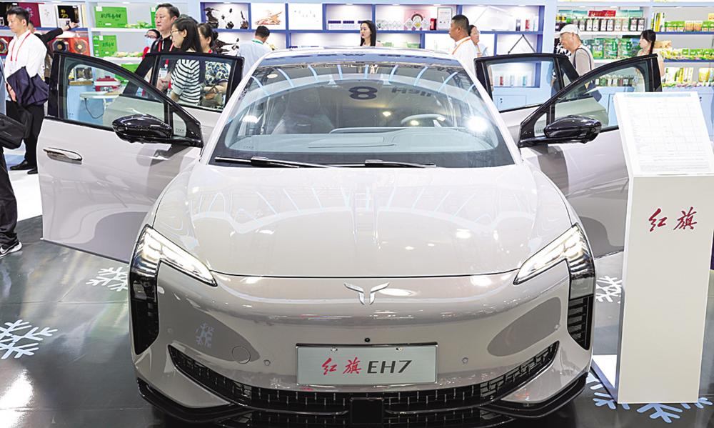 这是在第四届中国国际消费品博览会上展出的红旗新能源汽车(2024年4月13日摄)。新华社记者 杨冠宇 摄