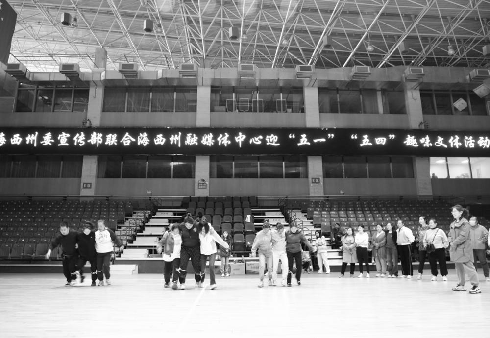 4月28日,海西州委宣传部联合海西州融媒体中心共同举行“庆五一·迎五四”趣味文体活动。 活动设置了绑腿跑、投篮赛、夹纸接力跑等个人和团体项目,场上参赛队员斗志昂扬、奋力拼搏,场下观众热情高涨、挥手呐喊,比赛高潮迭起、精彩频现。各组队员团结协作、齐心协力、各展所长,安全有序地完成了各项挑战,充分展示了媒体人积极向上、团结进取的精神风貌。 本报记者 查宝音 摄影报道