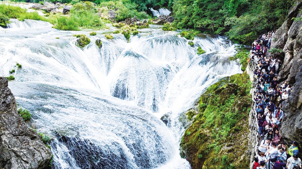 5月2日,游客在贵州省安顺市天星桥景区游览银链坠潭瀑布(无人机照片)。 “五一”期间,从东北到西南,从哈尔滨到贵州“村超”“村BA”现场,“网红”城市和“爆款”景点承受住了客流高峰的考验。游客在给城市、景区带来人气的同时,越来越多地感受到这些城市和景区的精细化管理和人性化服务,感受到这些城市将“流量”转化为“留量”的满满诚意。新华社发(陈熙 摄)
