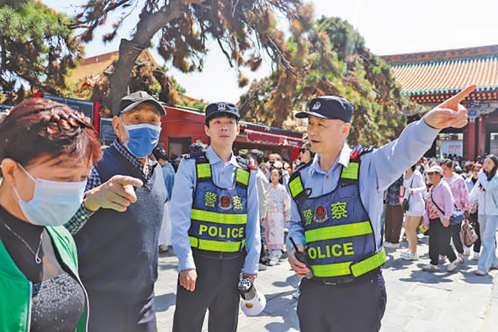 “五一”假期,辽宁省沈阳市,沈阳故宫博物院执勤岗位上,民警热情服务游客。 邹新江 摄(人民视觉)