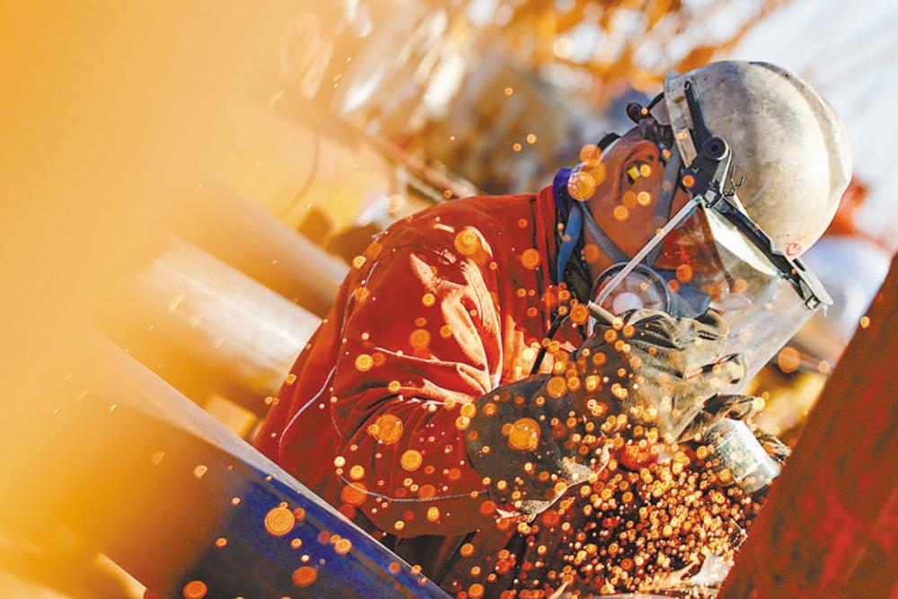“五一”假期,天津市渤海湾畔,海油工程塘沽建造场地,工人坚守岗位,进行海上平台建造施工。杜鹏辉 摄(新华社发)